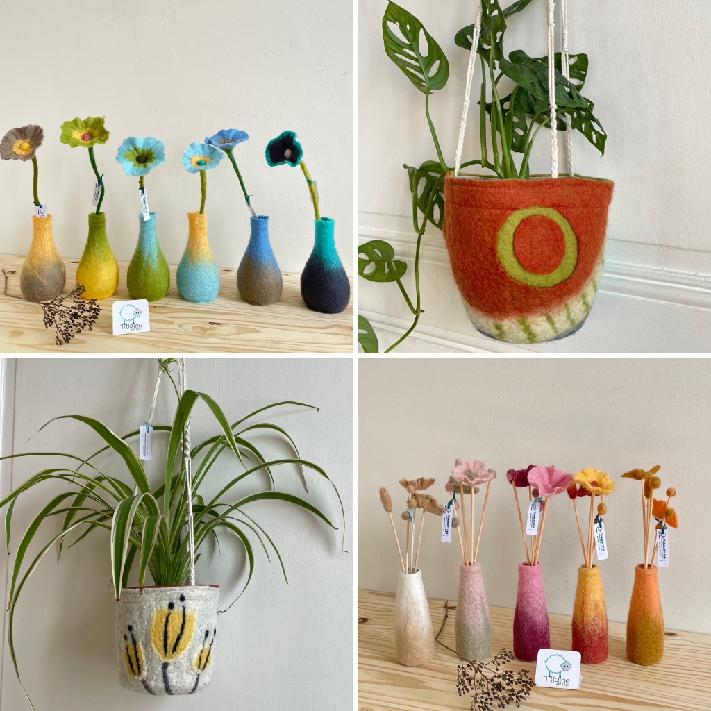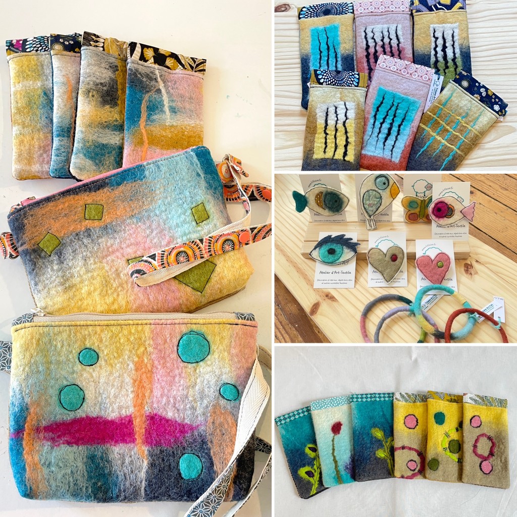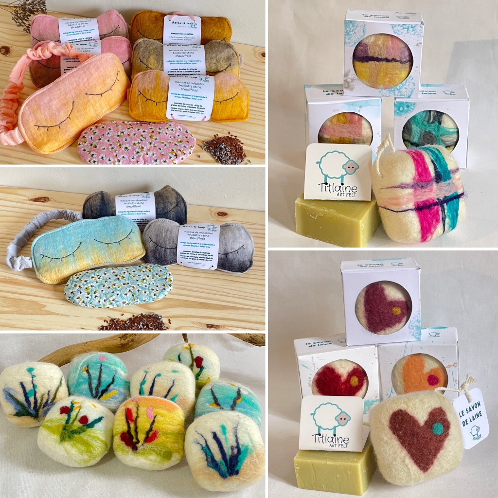 Grâce à ce savoir-faire ancestral revisité et vitaminé, Hélène crée de la décoration d’intérieur (cache-pots, tableaux Art-Fiber, vases en laine…), des accessoires bien-être (savons de laine, masques de relaxation) et de mode (étuis à lunettes, bracelets, broches…) Retrouvez ses créations d’Art-Textile en boutiques de créateurs, marchés d’artisans et sur son site internet.